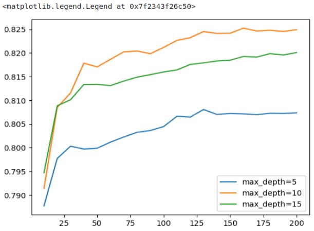 In the plot, we can observe that the AUC scores for ‘max_depth’ values of 10 and 15 are initially quite close, but after a certain point, the score for ‘max_depth‘ 15 begins to level off, showing only marginal improvement. In contrast, ‘max_depth‘ 10 continues to perform significantly better, peaking at around 125. This clearly illustrates that the choice of ‘max_depth‘ indeed matters. We can confidently select a value of 10 as the best choice, as the difference between 10 and 15, and between 10 and 5, is notably significant.